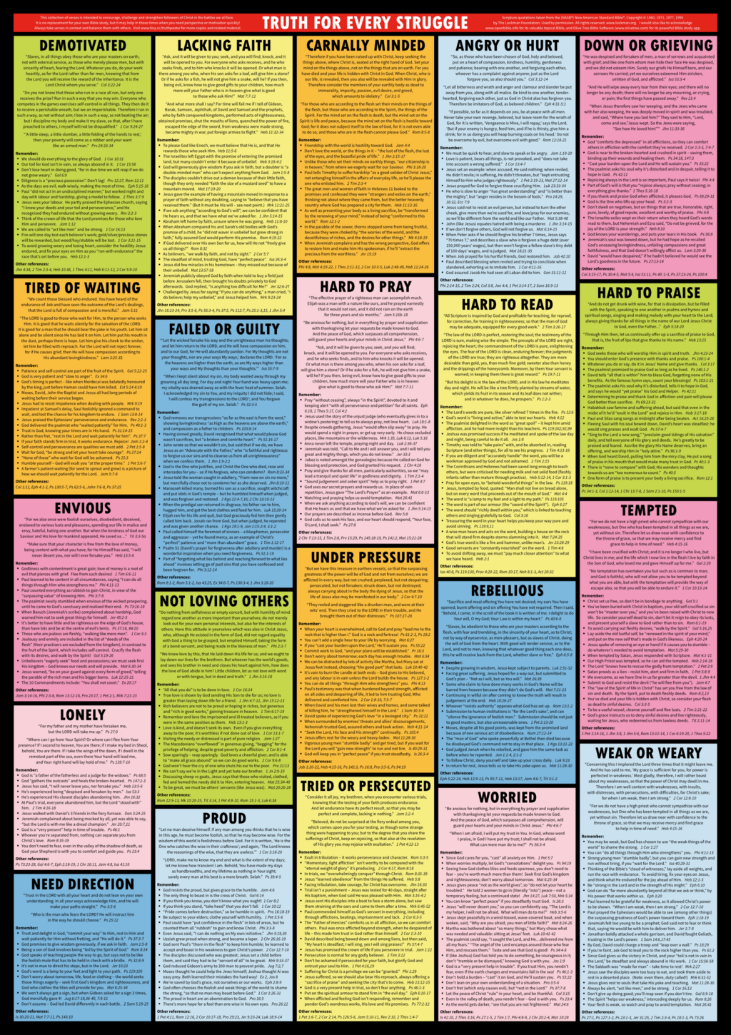 "Truth For Every Struggle" is a collection of verses and Scriptural reminders, designed to counter various struggles we all face as Christians. From anger to pride, and from weariness to lack of direction, every challenge is addressed by multiple truths from God's word, so you can find every solution in one place.